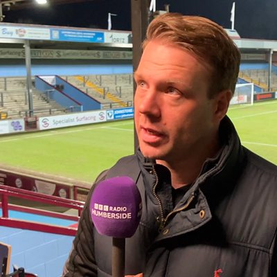 Scunthope United boss Jimmy Dean talks to Matt Dean ahead of the game at Aldershot Town.