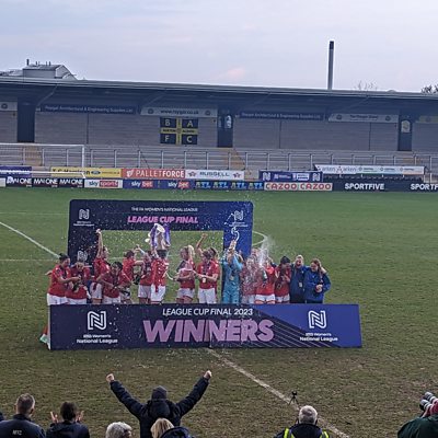 Forest Women captain Lyndsey Harkin speaks to Hannah Parker following the League Cup win.