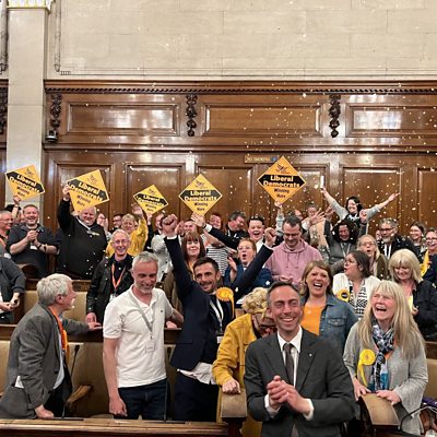 Council Leader Mike Ross speaks to Sarah Sanderson after gaining 3 seats on the council.