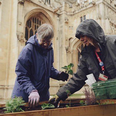 If you've been outside Gloucester Cathedral recently... you might have noticed new flowers and planters taking shape.That's because volunteers meet to look after them every Wednesday... But it's about more than just gardening as many of the volunteers are homeless or vulnerable... or wanting to learn new skills. Jon Smith has been along to find out more: