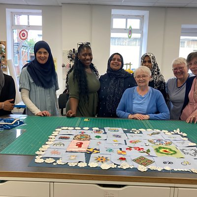 Jo Durrant visits the Friendship Cafe to meet those working on the Costume for Gloucester: Aysha Randera, Tia Callum who will wear it & stitchers Bernie, Sue, Maggie and Raheema.
