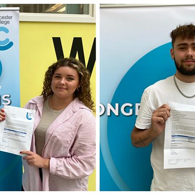 Thousands of teenagers across Leicester, Leicestershire and Rutland are opening up their A-Level, T-Level and BTec results today. The proportion of A or A* grades is 27.2% - down from a peak of 44.8% during the pandemic. Across the UK, 79% of those receiving results gained a place at their first-choice university, UCAS says. T-Level results are also being released, along with many AS-level and BTec Level 3 grades. T-levels were introduced in the 2020 academic year so this is the second year students have collected their results. Leicester College students Hannah Elliott and Kian Chapman open their results with ÃÛÑ¿´«Ã½ Radio Leicester reporter Conor O'Grady.
