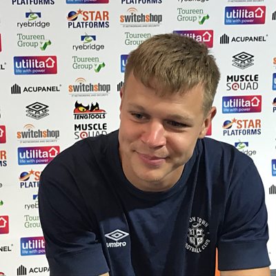 Luton Town defender Mads Andersen chats to Geoff Doyle.