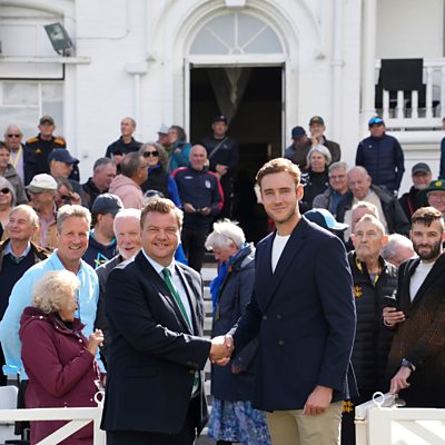 Stuart Broad reacts to having the Pavilion End named after him at Trent Bridge.