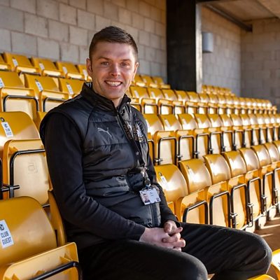 Port Vale Chief Executive Matt Hancock speaks to Phil Bowers