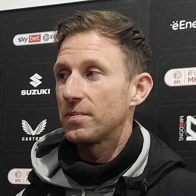 Mike Williamson reacts after MK Dons' 5-3 win over Harrogate Town.