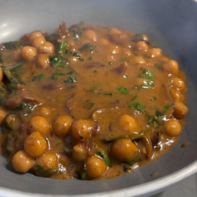 Caramelised onion harissa chickpeas Ingredients: 2 teaspoons oil 1 medium onion thinly sliced, or about 1 ½ cups 1 teaspoon balsamic vinegar ½ teaspoon salt or more to taste, divided 1 tablespoon garlic paste or 4 cloves of garlic, minced 1 teaspoon smoked paprika 2 tablespoons harissa paste , see note for less spice ½ teaspoon dried oregano 2 cups (80 g) of chopped leafy greens of choice such as Swiss chard, spinach, mustard greens, etc. This is measured with fresh greens packed really well, but you can use any amount of greens that you like. 15 ounce (425.24 g) can of chickpeas drained or 1 ½ cups cooked chickpeas or other white beans 1 cup (236.59 ml) full fat coconut milk or coconut cream Use the entire can if you like it more saucy. lemon juice, coriander, and black pepper, for garnish Instructions: 1. Heat a large frying pan over medium heat. Add the oil, and once it’s hot, add the onion and ¼ teaspoon salt . Mix well to coat, and continue to cook, stirring occasionally. If the pan is drying out too much, add 2 to 3 teaspoons of water to help the pan conduct heat and for the onions to brown evenly, about 7 to 9 minutes. Then once the onions are translucent and starting to get golden on some outer edges, add the balsamic vinegar and mix well. Continue to cook for another 3 to 4 minutes. 2. Then add in the garlic, smoked paprika, harissa, and oregano, and mix really well. Cook for a minute, so that the garlic gets cooked. 3. Then add in the chard, remaining salt, the chickpeas, and the coconut cream and mix really well. 4. Simmer for 8 to 10 minutes, then taste and adjust the flavor. If you want more sauce, you can add more nondairy milk. 5 Add in a good squeeze of lemon juice and adjust salt and heat as needed. 6. Serve with flatbread or rice or with some sourdough toast or garlic bread or whatever else that you like.
