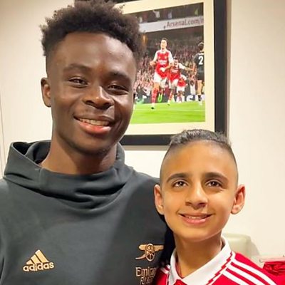 Mikey Poulli lost his sight aged just six due to a rare degenerative condition, rod-cone dystrophy. But his love of football is still as strong as ever. Mikey, now aged 14, has met and trained with a host of football stars. He now trains with the England Blind team and when he's old enough, in two years time, he hopes to help the team win the Blind World Cup for the first time. Sportshour's Caroline Barker has been speaking to Mikey and his dad John about playing football and that all important match day experience as a blind fan. Photo: Bukayo Saka and Mikey Poulli share a smile at the Arsenal (CREDIT: Mikey Poulli, INSTAGRAM/@mikeypoulli)