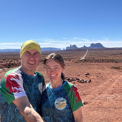 Y gŵr a gwraig Hugh a Fiona Morgan yn sgwrsio gydag Aled am eu her redeg ddiwedaraf.