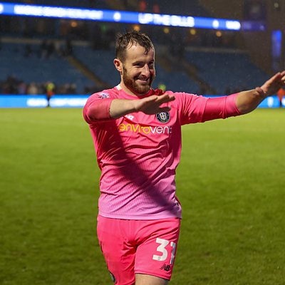 Harrogate Town goalkeeper James Belshaw speaking to Tim Steere, after he saved a penalty in their 1-1 draw away at Fleetwood Town