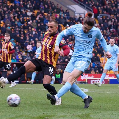 Harrogate Town midfielder Ben Fox speaking to Tim Steere, after their 1-0 defeat away at Bradford City