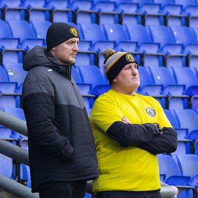 York Knight head coach Mark Applegarth speaking to Peter Spencer, ahead of their Championship match against Toulouse.