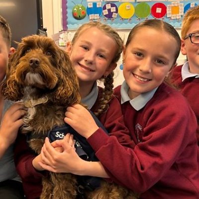 Rhai o blant Ysgol Llanrug a'r ci sy'n ffrind i bawb yno!