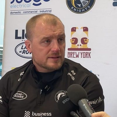 York Knights head coach Mark Applegarth speaks to Andy Atkinson after a 36-10 win against Sheffield Eagles in the Championship.