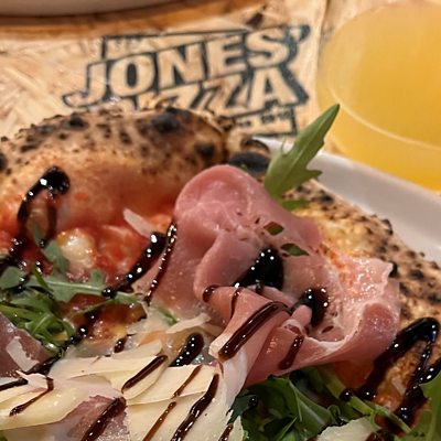 Aled yn sgwrsio gyda Richard Jones o fwyty pitsa Jones Pizza.