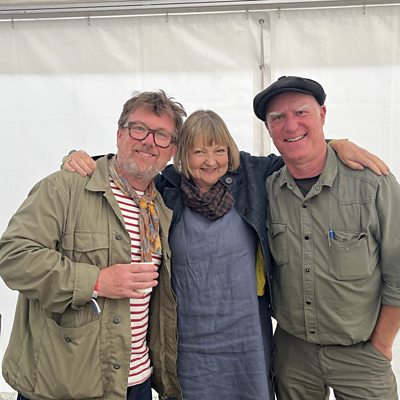 Cefn llwyfan gyda Pat a Potter ar ôl sgwrsio ar banel yn Eisteddfod Genedlaethol Wrecsam.