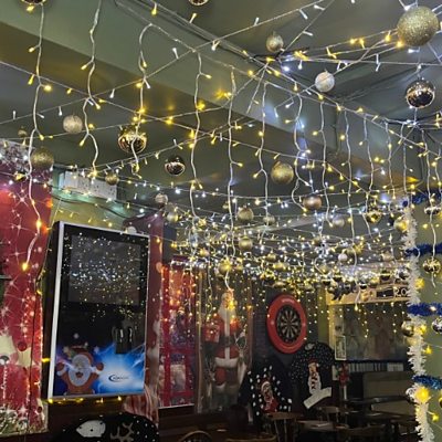 The Cambridge pub with it's Christmas decorations which have been up since October.