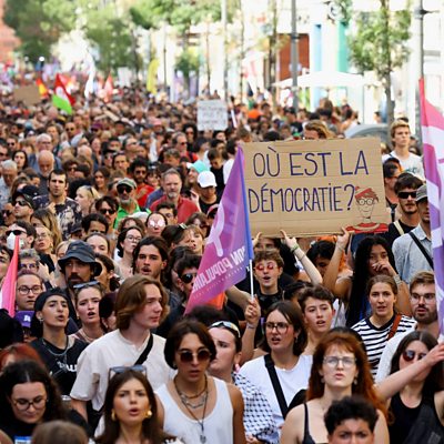 Democracy, the deepening polarisation of politics, race relations and President Macron’s grip on power – all are up for debate as Jonny Dymond is joined by a panel of leading French politicians who take questions from the public. The panel: Eléonore Caroit: National Assembly Deputy, Renaissance Fabrice Leggeri: Member of the European Parliament, National Rally Danièle Obono: National Assembly Deputy, France Unbowed Florence Faucher: Professor of Political Science, Science Po University Producer: Helen Towner (Image: Demonstrators in Paris protest against President Macron's refusal to name a leftist Prime Minister. Credit: Reuters/Manon Cruz)